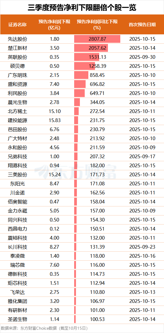 又有一批A股上市公司2025年前三季度业绩预告出炉,总体以预增为主。若以业绩预告净利润同比增长上限来看,多家公司前三季度净利润同比或实现翻倍。